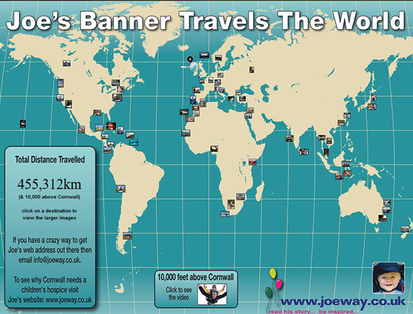 How far has it travelled so far...See how far Joe's banner has travelled so far with our interactive global map. It's filling up fast but there are still a lot of destinations to visit. Click on the markers to see the bigger photos. You can check out the map by clicking here.